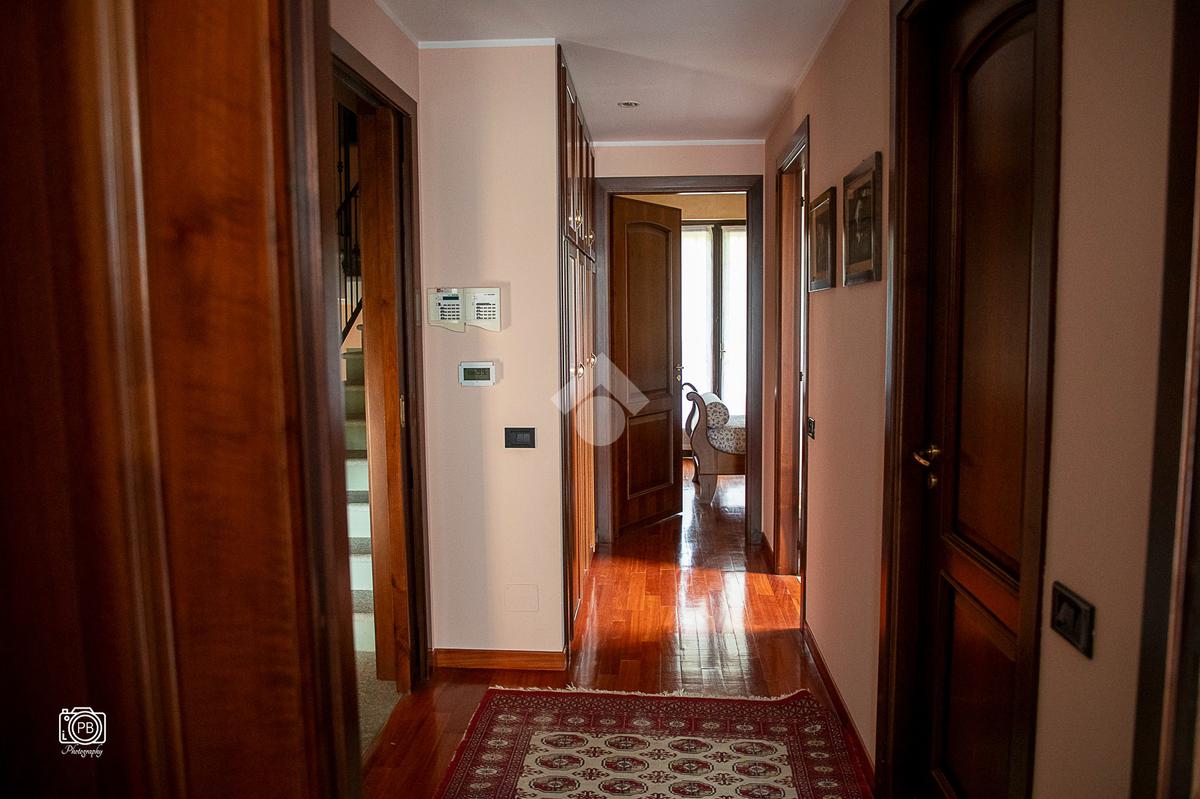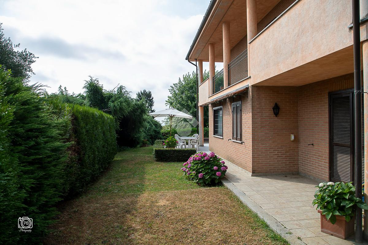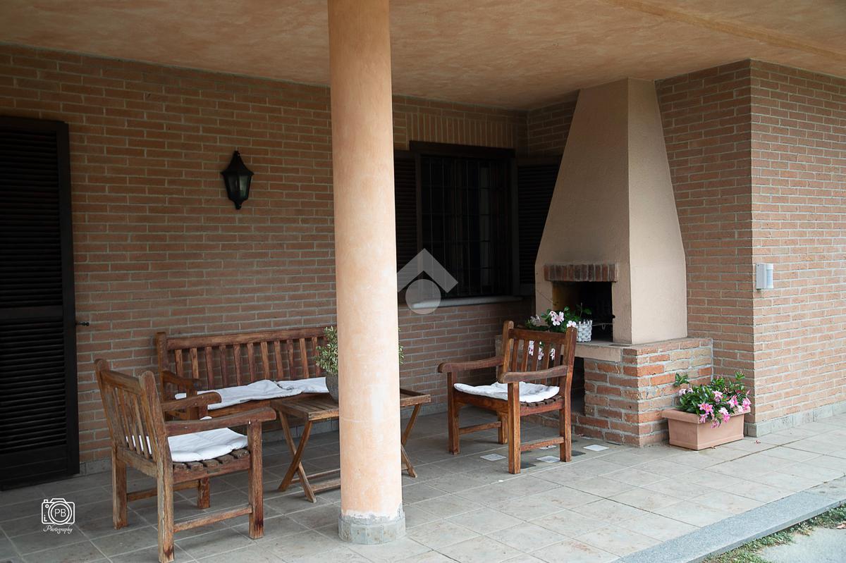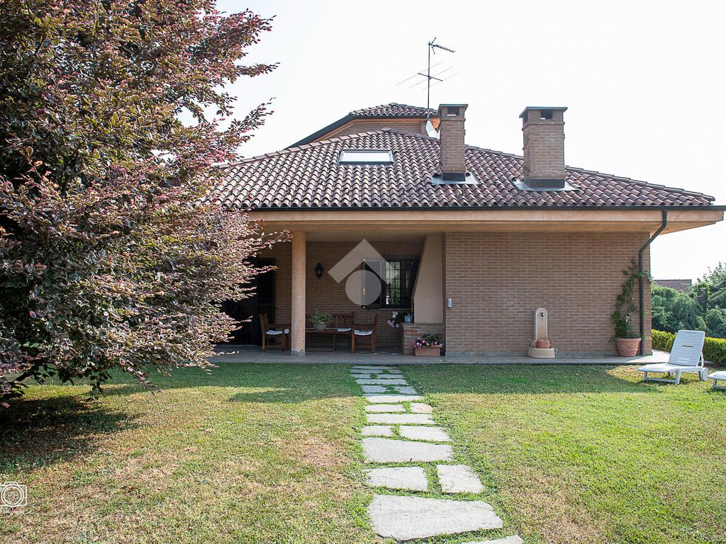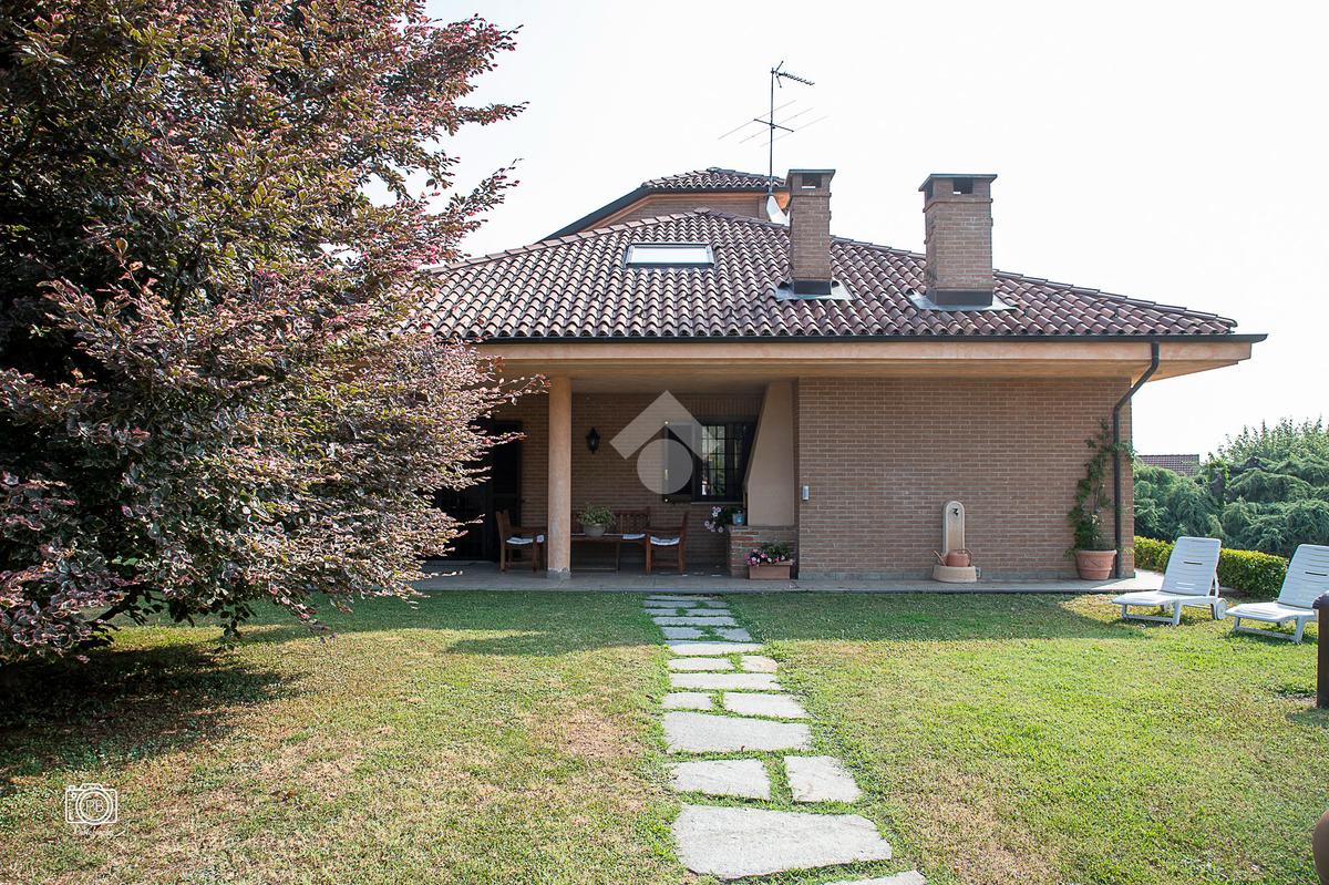Elegante villa indipendente, realizzata nel 1996, libera su quattro lati e circondata da un terreno esclusivo di circa 1.400 mq, suddiviso tra giardino pianeggiante e parco piantumato. L’ubicazione di questa soluzione è strategica : vicina al centro del paese e a tutti i principali servizi, offre allo stesso tempo un’oasi di assoluta tranquillità, immersa nel verde e con una vista panoramica mozzafiato sulle pianure e sulle Alpi circostanti. L’abitazione si sviluppa su quattro livelli e presenta una distribuzione degli spazi studiata per offrire comfort, funzionalità e massima vivibilità. Al piano terra si viene accolti da un ampio salone doppio e zona giorno comprende anche una sala da pranzo e una cucina abitabile con accesso diretto a un patio coperto, attrezzato con barbecue e zona pranzo, completano il piano un disimpegno, un elegante bagno rifinito in prezioso travertino e una spaziosa camera padronale. Tutti gli ambienti di questo livello dispongono di accesso diretto al giardino. Al primo piano si trovano un disimpegno, due bagni e due camere da letto con accesso diretto a un terrazzino che gira intorno al perimetro della casa, offrendo una vista continua sul paesaggio. Sempre su questo livello, è presente un ampio studio con bagno privato, perfetto come zona lavoro o ambiente per gli ospiti. Il secondo piano è composto da uno splendido terrazzo panoramico, di dimensioni pari alla superficie dell’abitazione,dotato di punto acqua: un ambiente unico, ideale come solarium, giardino pensile o area lounge con vista a 360°. Al piano seminterrato si sviluppa una tavernetta con camino a legna. Sono presenti inoltre un bagno, una lavanderia, locali di servizio e deposito, una cantina e un’autorimessa di circa 90 mq, collegata internamente. L’intera abitazione è circondata da un’intercapedine che garantisce isolamento e protezione strutturale, dettaglio tecnico di grande valore. All’esterno, il giardino è curato e arricchito da percorsi in pietra di Luserna. La conformazione del terreno consente la realizzazione di una piscina.